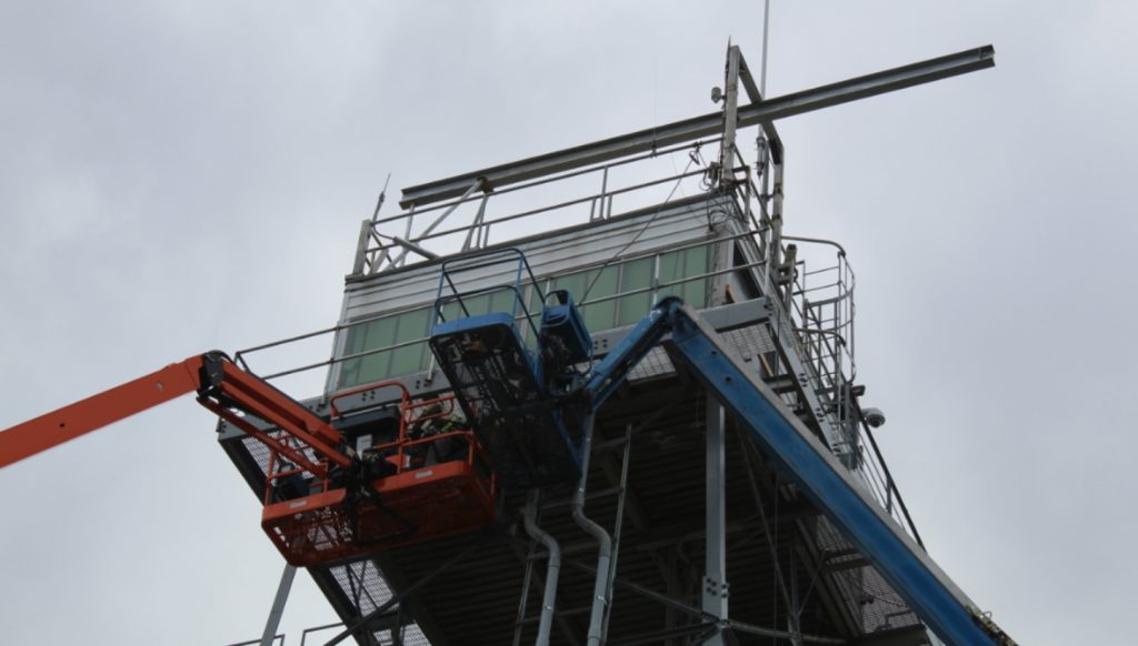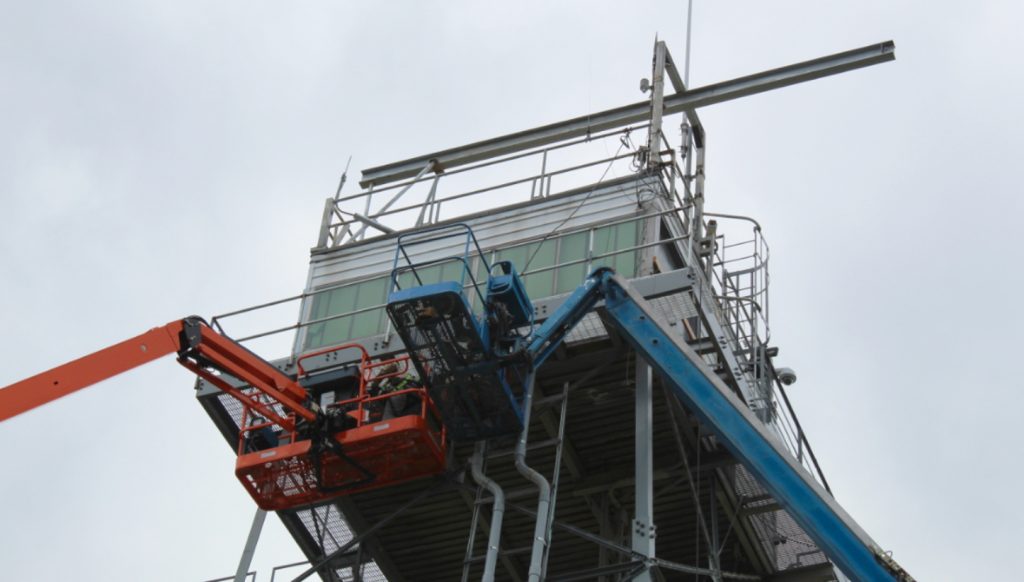 Phase five was for the installation of new structural repairs, installation of new middle platform and stairs, installation of new monorail and hoist systems and re-construction of middle equipment room (stack) and painting of the tower. Phase six consisted of the NRL End Users reinstallation of the associated antennas equipment and wiring in middle equipment room (stack).